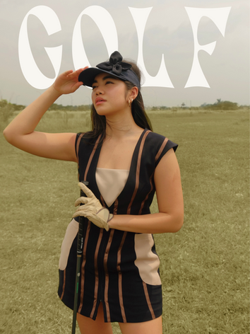 Intertwined, Duality, and Inclusivity, these are the keywords chosen as the inspiration of the GOLF collection. These three words were chosen through a team process of analyzing trends and PESTLE factors throughout the decades. Following today's trends in fashion, the design consists of more calm, muted, neutral colors, this is also to represent the simple elegance and high-class feel of golf. With sportswear having such an impacts on the fashion world, as we see with tennis skirts and balletcore the design is made to be functional yet fashionable enough to wear on a day-to-day. The chosen look of this collection consists of two outfits, the dress featuring the classic A-line skirt usually found in golfing attire and a two piece tracksuit to double over or wear on its own on a more windy day out on the course.
