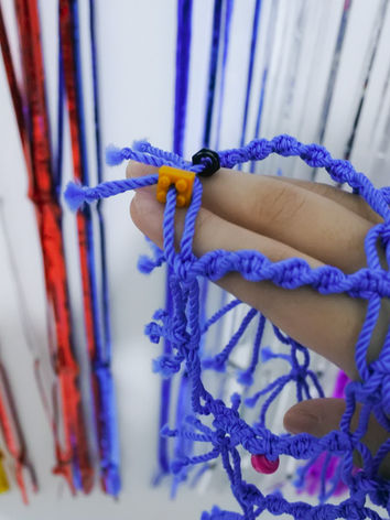 The ribbing for the neckline, shoulders, and arms are created using the crochet techniques, and within, are applied several crochet techniques too as yet another form of freedom. The crochet also creates a space for tapestry techniques to be applied, while the tube top used knitting techniques and the macrame techniques are done for the latter part of the arms. The crochet along the knit area are made using a cotton yarn, while the macrame area used polyester yarns to creates more visible knots. Leftover denims and felt fabrics are used for the tapestry and around the macrame parts, mini toy blocks that are overly produced are drilled and applied alongside the knots to create even more playful feels!