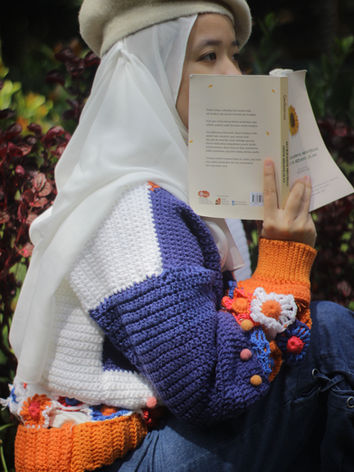 I want to show a cheerful ambience through bright color palettes. There are also floral accents and colorful pompoms to enliven and create a happy atmosphere. The techniques used in this sweater are crochet for the bodice and sleeves, macrame for the front accents and felting for the pompoms on the bodice and sleeves. The materials are milk cotton yarns, leftover ropes and threads, leftover jump rings, and silk yarns. I try to make use of leftover and used materials so that it doesn't produce a lot of waste.
